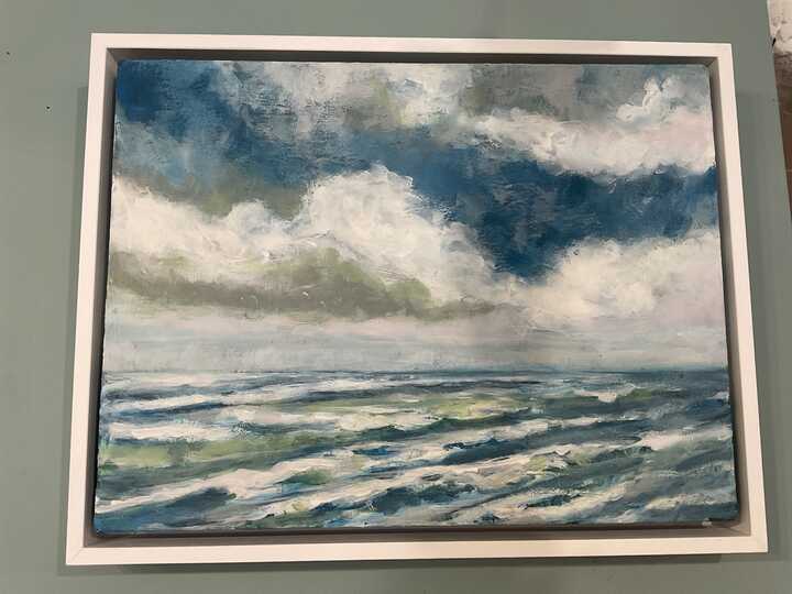 Small cloudy sky sea painting by Louise Atkinson. Acrylic on canvas framed in white wooden frame. 43.5cm W 34cm H 5cm D