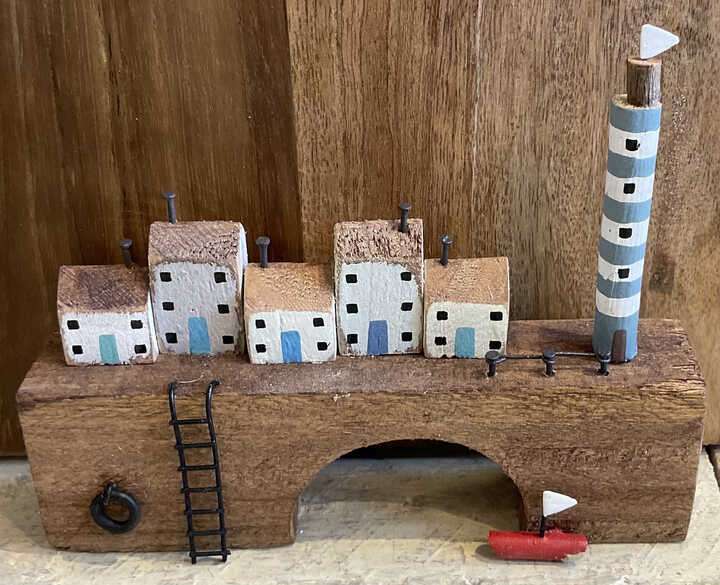 Cottages and lighthouse on wooden block, a lovely seaside decoration for your home H 11cm W 13cm D 2.5cm